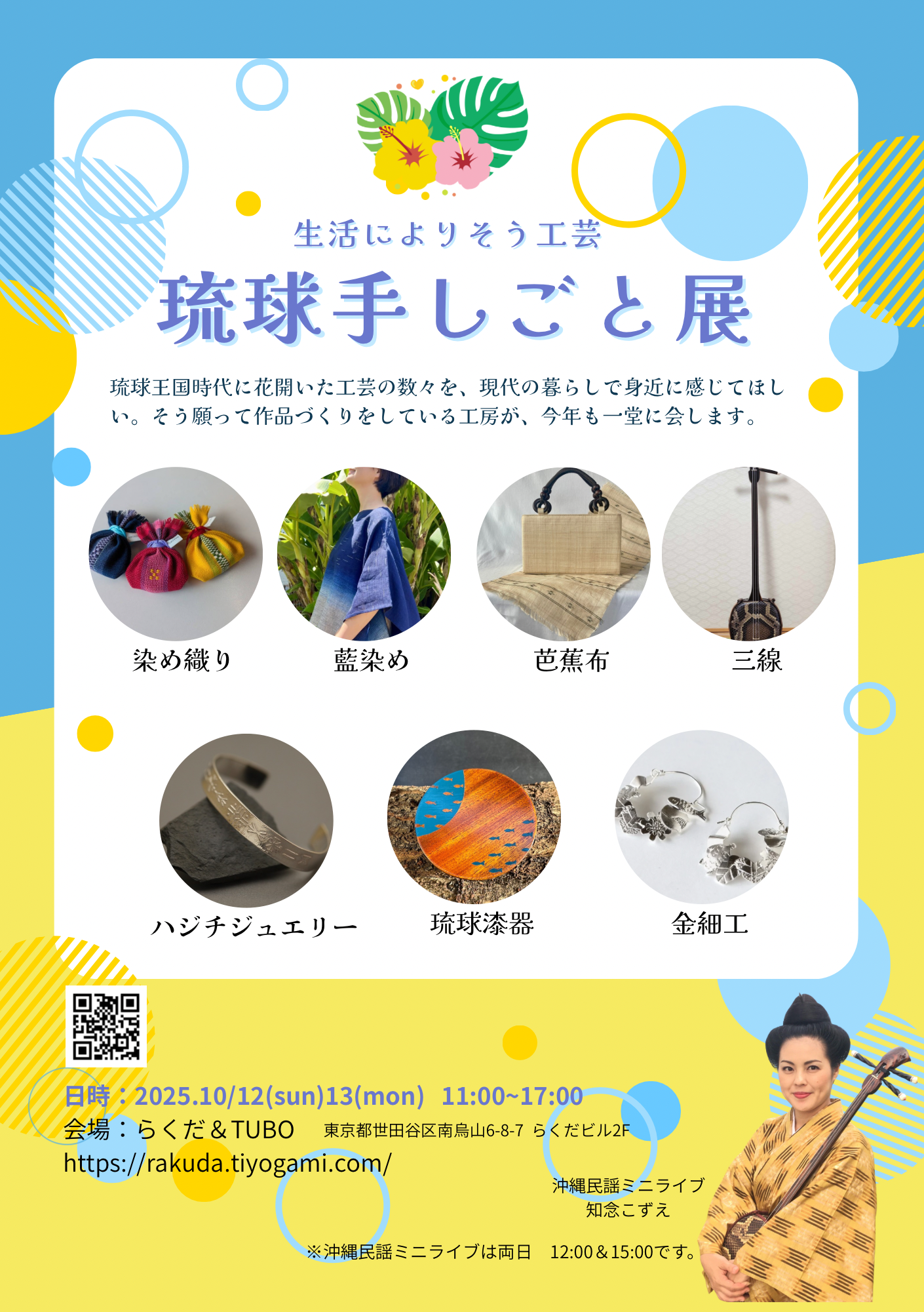 琉球王国時代に花開いた工芸の数々を、現代の暮らしで身近に感じてほしい。そう願って作品づくりをしている工房が今年も一堂に会します。 沖縄民謡ミニライブを両日 12:00と15:00から行います。 詳しくはこちらからチラシを御覧ください。 |